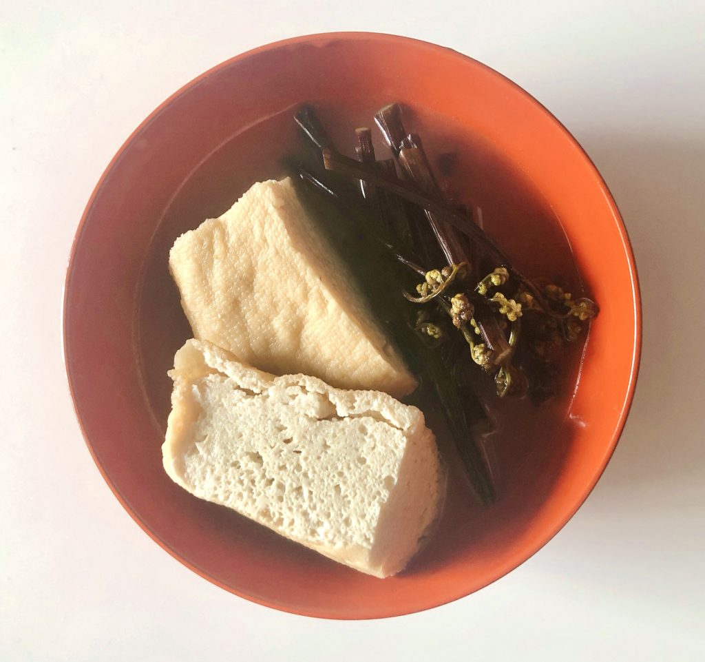 今回は味付厚揚げを汁ごと使いました。蕨をアク抜きしておけば、後は材料を切ってサッと煮るだけの楽ちんメニューです。厚揚げに染みたお出汁が美味しい一品です。