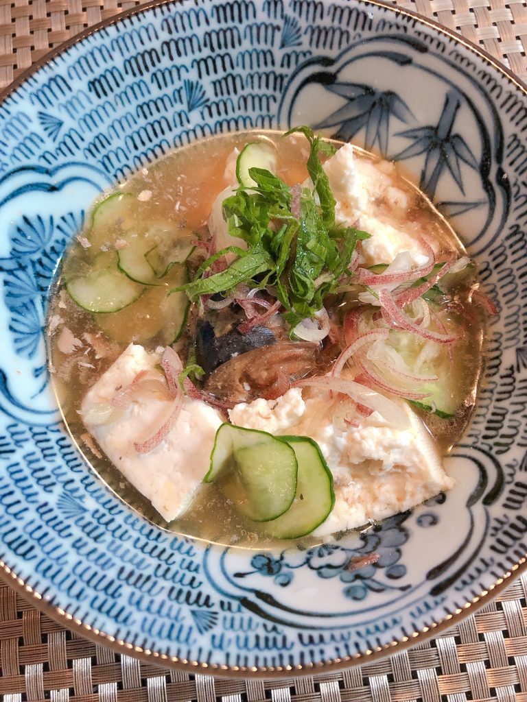 - 器に木綿豆腐を手でちぎりながら入れ、水気を絞ったキュウリ、3.の汁をほぐした身ごと注ぎ、みょうが、大葉の順に乗せ完成。