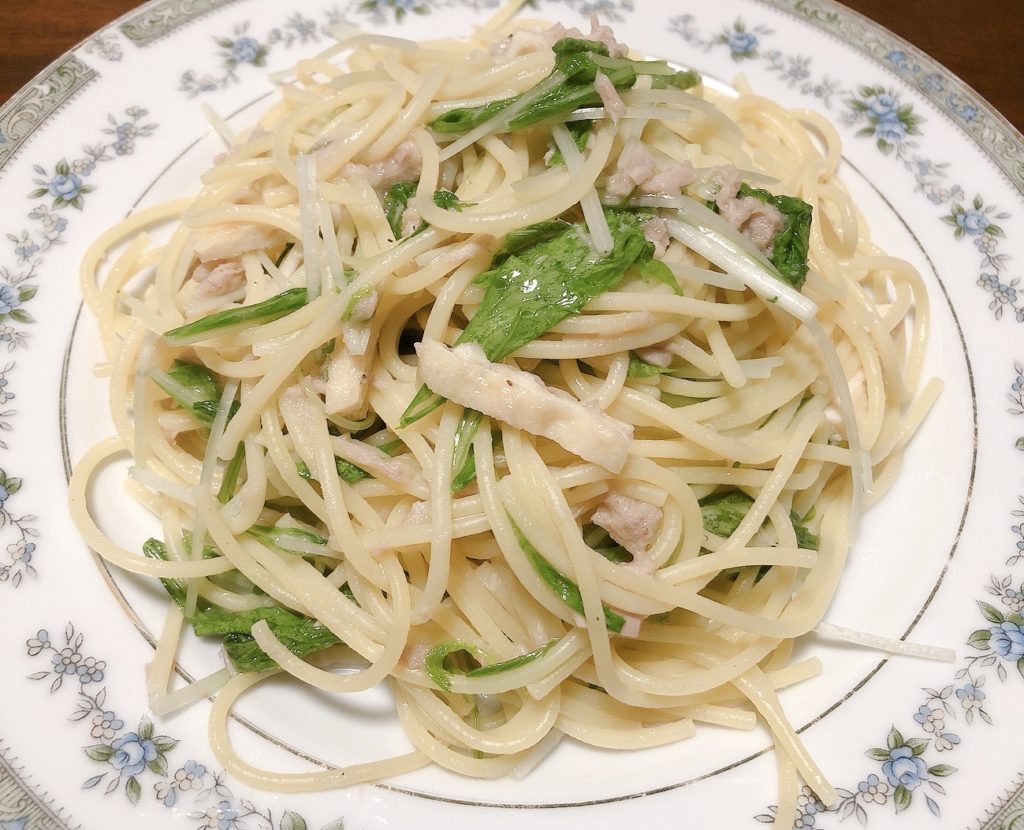 刻み揚げで作る和風パスタ。ポイントは水菜を入れたら火を入れすぎない事。水菜のシャキシャキ感と刻み揚げのアクセントが美味しい簡単メニューです。ぜひ作ってみて下さい。