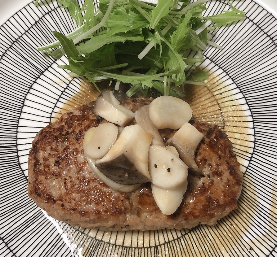 - 器にハンバーグ、その上にエリンギを乗せソースを回しかける。水菜を添えて完成。
