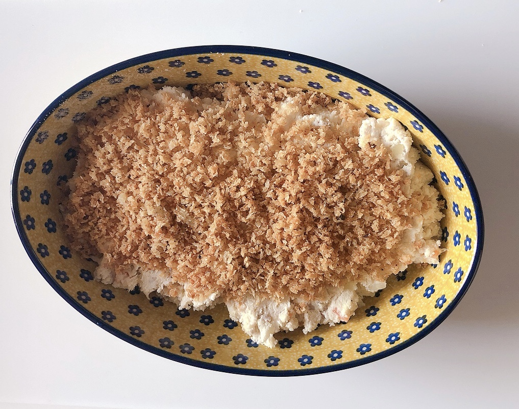 - 盛り付け予定の器にパン粉を入れてみて量を決める。